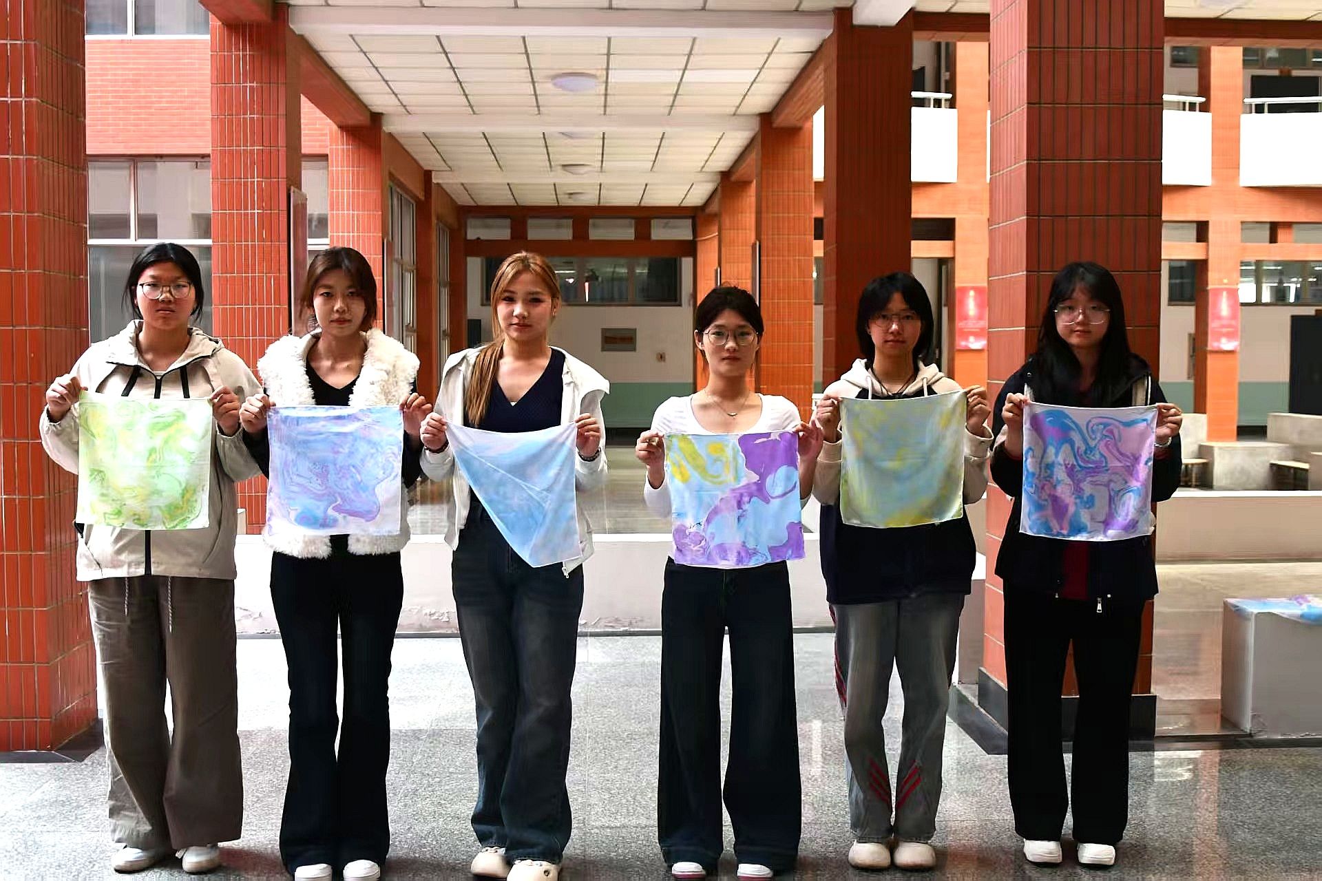活动现场准备了许多丝巾坯布与安全环保的染色颜料,大家在轻松的氛围里,用晕染、点涂、勾勒等方式进行创作。同学们自由搭配色彩,大胆发挥创意,将心中的美好图案一点点呈现在丝巾上。从调色、上色到固色,每一步都充满动手的乐趣,每个人都在专注中完成了属于自己的独特色彩作品。一块块素净坯布在同学们的巧手下,变成了风格各异、独一无二的染色丝巾,有的温柔婉约,有的活泼明快,每一件都承载着专属的创意与心意。
