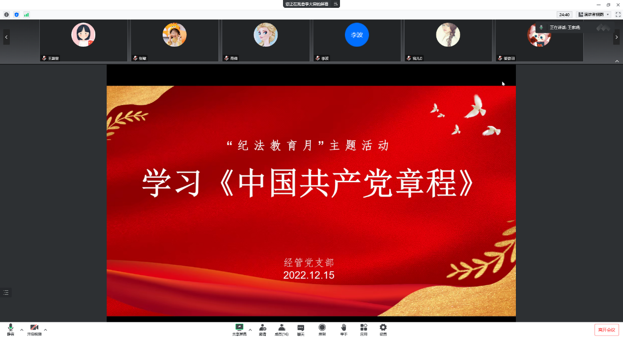 为了敦促党员领导干部加强党章党规党纪、法规法纪学习,提升依规依纪依法履职能力,12月15日下午,经管党支部线上开展了关于“纪法教育月”主题党日活动。主题党日活动由党支部书记李大容主持,经管党支部全体党员参加。