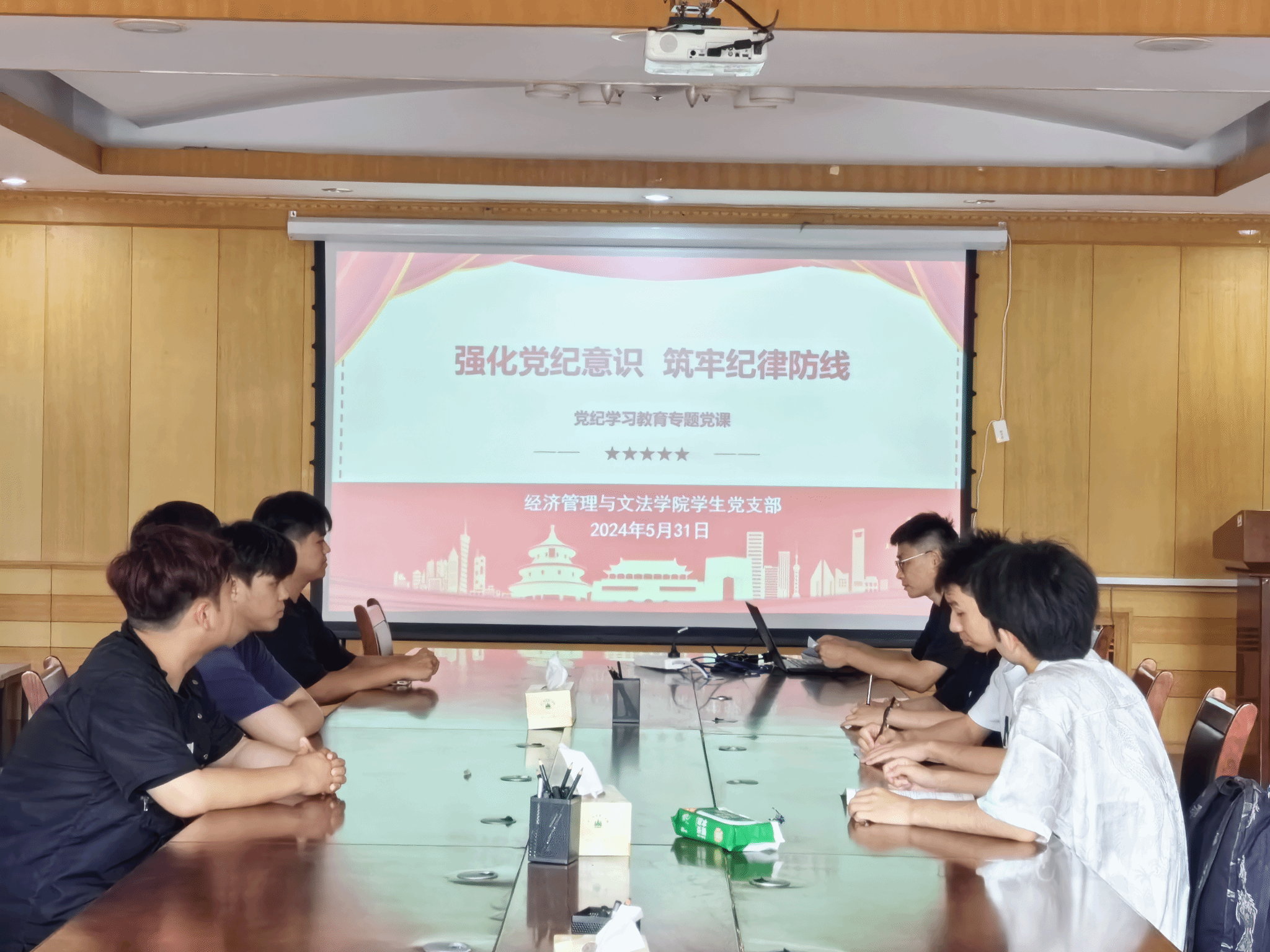 为切实做好毕业生党员离校前工作,坚定毕业生党员理想信念,发挥党员先锋模范作用,经济管理与文法学院学生党支部于6月18日组织开展“青春新启程,党性永流传”2024届毕业生党员离校教育活动,文法学生党支部书记袁振河主持此次活动,全体毕业生党员参加。