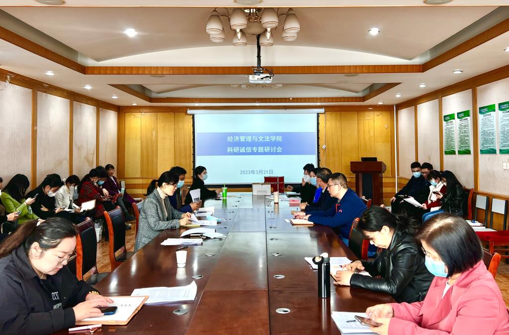 2023年3月21日下午,经济管理与文法学院在经管楼209会议室召开科研诚信专题研讨会,学院科研工作负责人刘力榕主持会议,全体教职工参会。