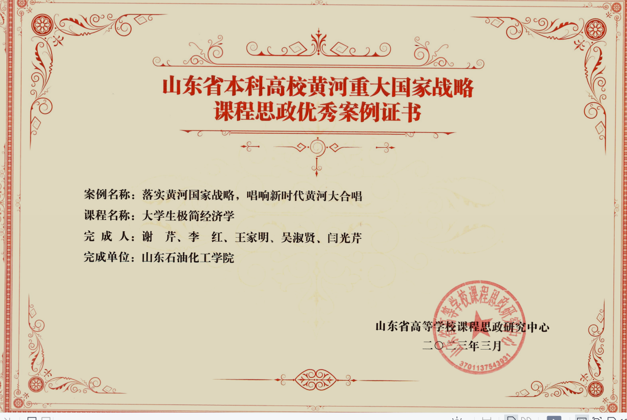 近日,yl23455永利集团谢芹老师团队申报的教学案例《落实黄河国家战略,唱响新时代黄河大合唱》获评山东省本科高校黄河重大国家战略课程思政优秀案例。该教学案例由《大学生极简经济学》教学团队打造,从课程内容、教学方法、考核方法等方面改革创新,将黄河流域生态保护和高质量发展的内容融入课程教学,实现知识传递、能力提升及价值引领的有机融合,是将黄河国家战略落实到人才培养和课程建设领域的一次有益的尝试。