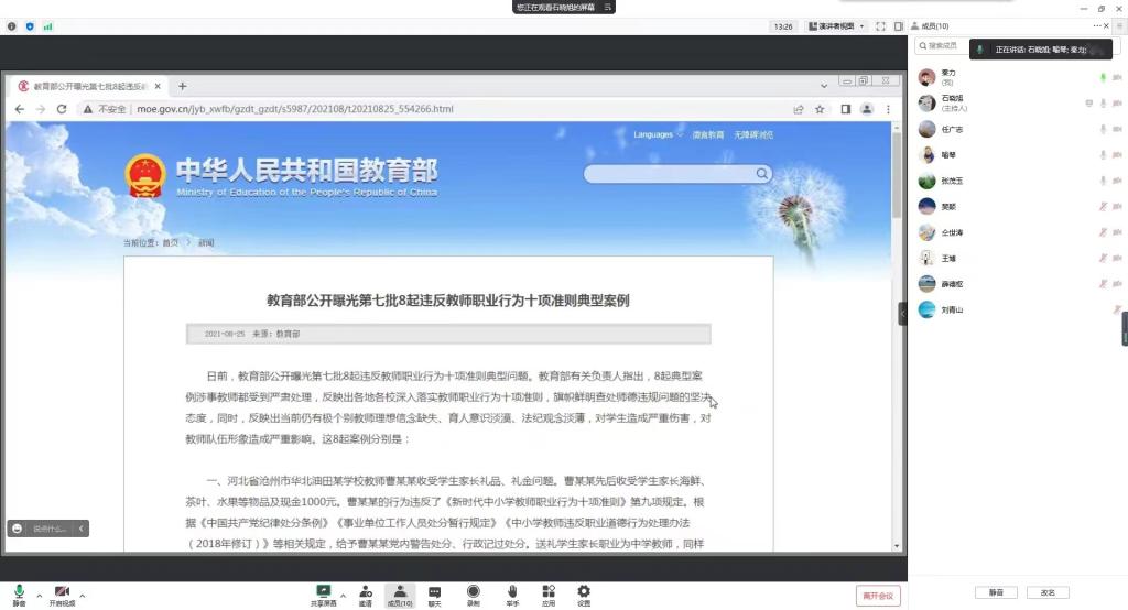 会上,各系主任们领学了《新时代高校教师职业行为十项准则》,并对《准则》进行了深刻解读。随后,对教育部网站公开曝光的违反教师职业行为十项准则典型案例进行了学习。
