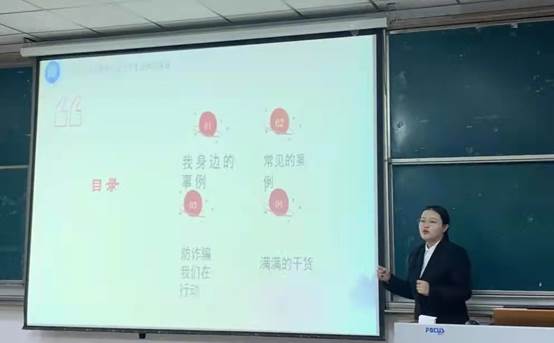 随后,殷国莉同学用鲜活生动的常见实例为同学们深入讲解了防诈骗的法律知识。她重点讲解了如何防范校园诈骗、网络诈骗等迷惑性较强的诈骗。最后,殷国莉再次强调同学们要时刻绷紧防范之弦,保持理性思维,多关注防骗信息,以免落入诈骗的圈套。