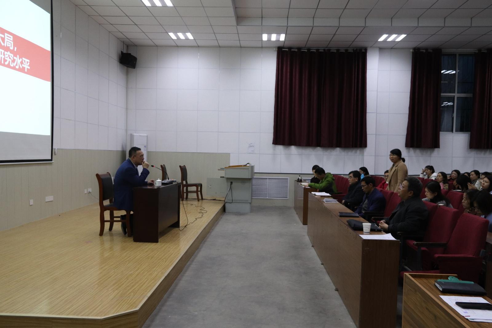 首先,刘院长分别对董主任、教学科研处、教育与艺术学院各位领导及老师的到来表示欢迎,并向与会人员简要介绍董主任的简历。随后,董主任结合自己的工作经验从东营市社会科学规划课题的选题、提高社会科学研究的质量和水平、推进社会科学研究成果的推广和转化等三方面进行了详细的讲解。最后的互动交流环节,部分教师就社科评奖、课题申报及选题等内容向董主任进行了咨询,董主任给予了详细的解答。