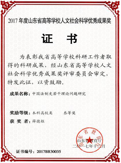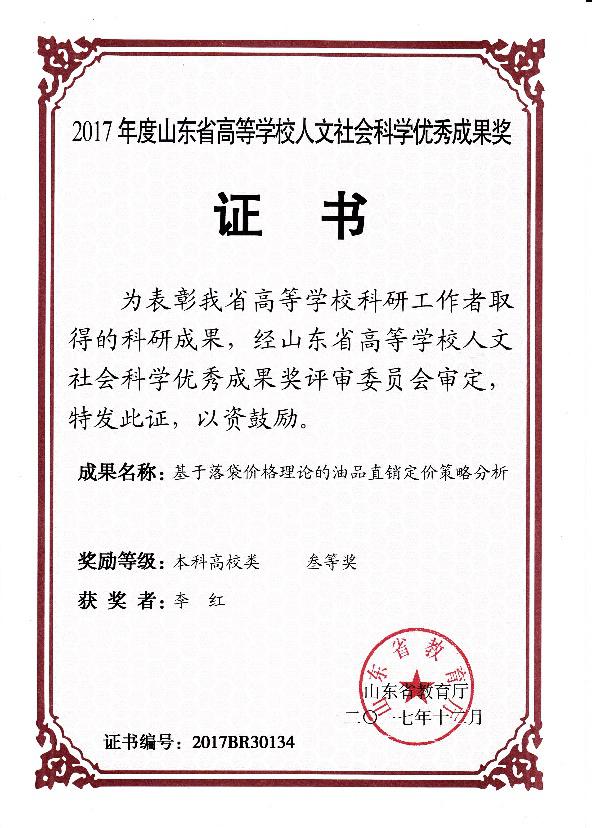 近日,山东省教育厅公布了2017年度山东省高等学校人文社会科学优秀成果奖评审结果,yl23455永利集团3名教师喜获三等奖,分别是薛德枢院长的《中国法制史若干理论问题研究》、李红老师的《基于落袋价格理论的油品直销定价策略分析》和李伟娟老师的《基于熵-生态位理论的黄河三角洲文化创意产业竞争力评价》。这是yl23455永利集团教师自2014年以来首次获得这一奖励。