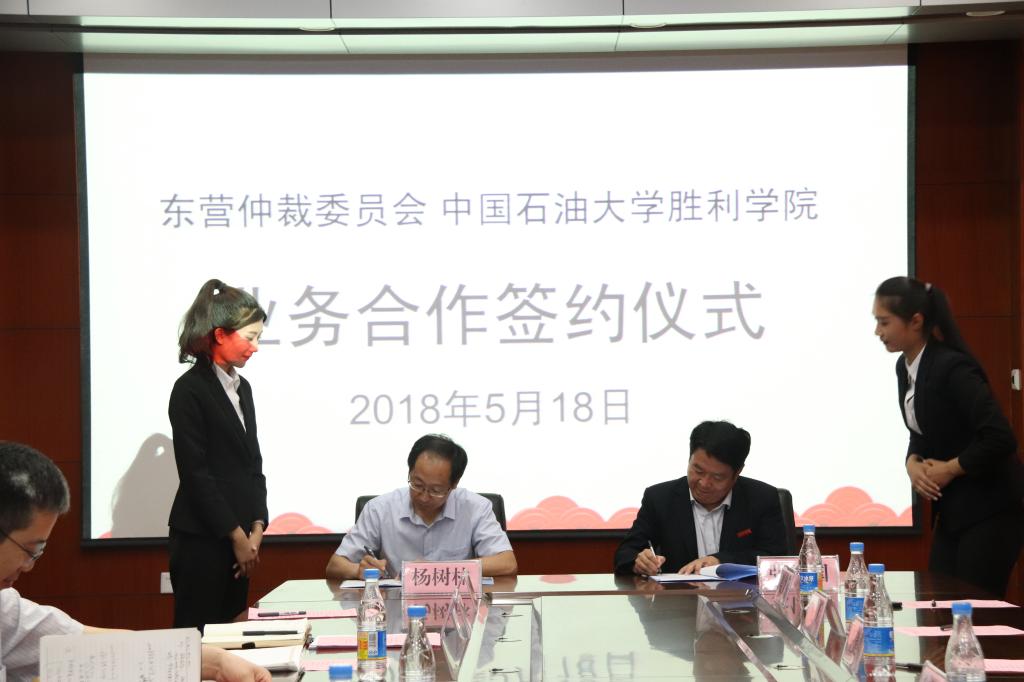5月18日下午,我校与东营仲裁委员会在主校区501会议室签订院委业务合作协议。东营仲裁办党组书记、主任薛在山、东营仲裁办党组成员、副主任张俊国、东营仲裁办调研员王建明,我校副院长赫正、教学科研处处长杨树林、副处长王贞及文法与经济管理学院有关领导参加仪式。仪式由文法与经济管理学院执行院长薛德枢主持。