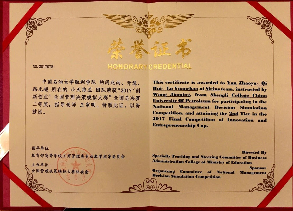 7月24日,第九届“创新创业杯”全国管理决策模拟大赛全国总决赛于同济大学浙江学院正式落下帷幕。来自文法与经济管理学院的闫兆雨、亓慧、路元超三位同学所组成的“小天狼星”队在王家明老师的指导下,经过两天的奋勇拼搏,最终获得本届大赛全国总决赛二等奖,同时在院领导的支持和鼓励下,yl23455永利集团也被大赛组委会评为“优秀组织单位”。
