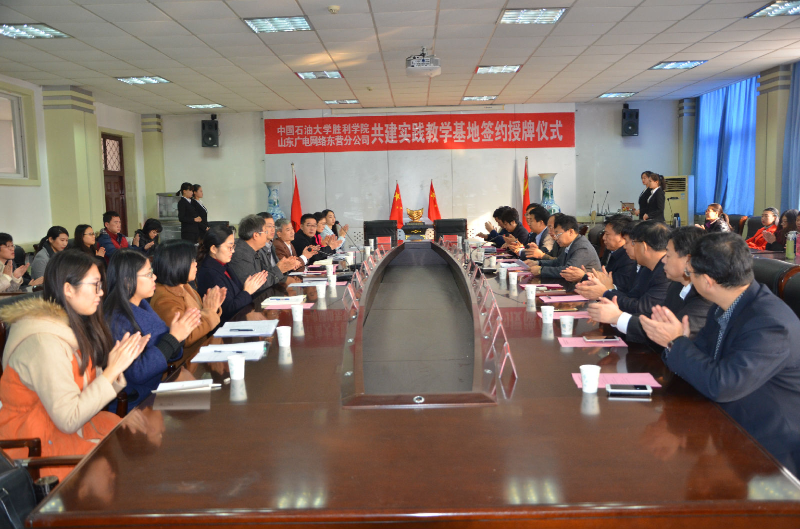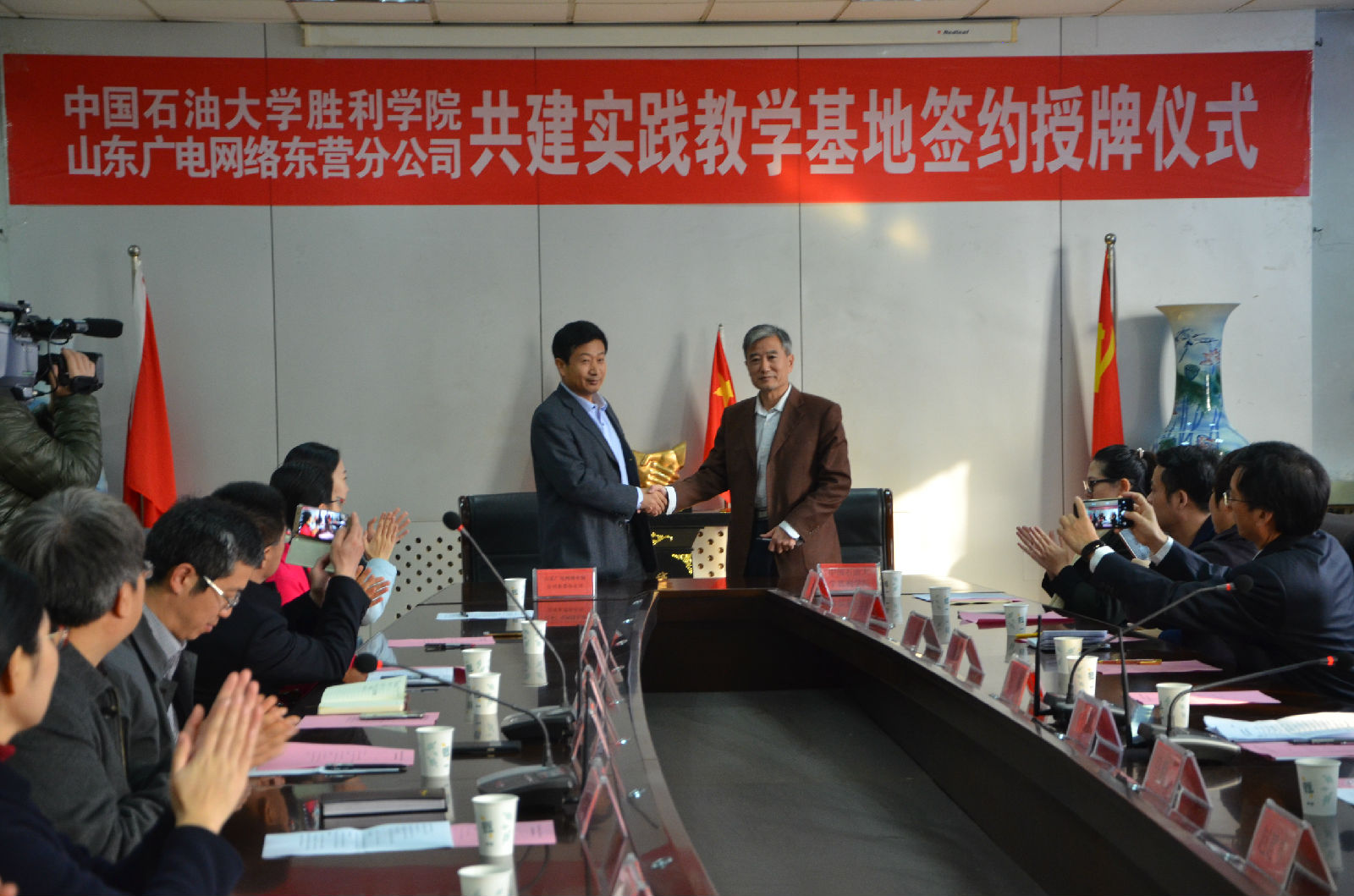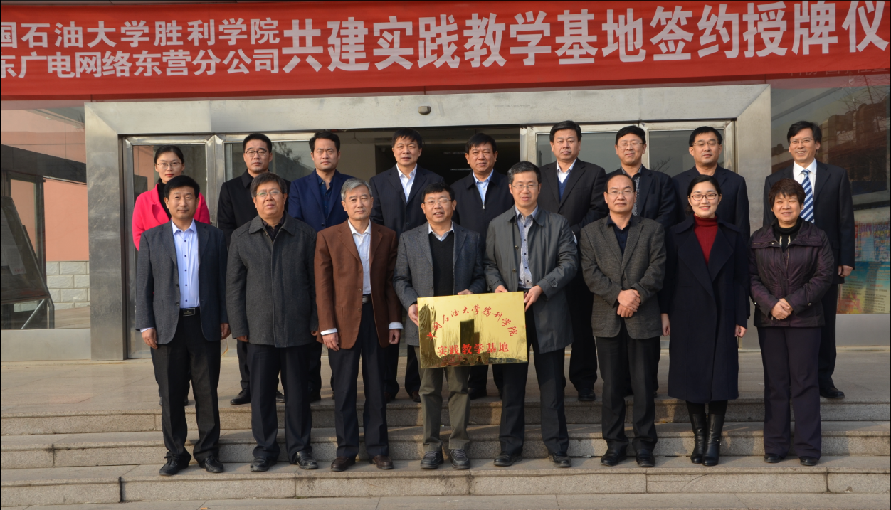 11月29日上午,yl23455永利集团与山东广电网络有限公司东营分公司于中国石油大学胜利学院师专校区新教一楼会议室举行共建实践教学基地签约授牌仪式。出席此次签约授牌仪式的领导和嘉宾有:东营市市委宣传部副部长、文明办主任徐教连,山东广电网络有限公司东营分公司党委书记总经理马勤建、总经理助理王峰、东营区分公司经理赵建亭、河口分公司经理张振祥、垦利分公司经理张和民、广饶分公司经理徐小冰、利津分公司经理李福永,中国石油大学胜利学院副院长赫正、教学科研处长周西臣,文法与经济管理学院执行院长薛德枢、党总支书记周向军、副院长王贞、经管系主任刘力榕及经管系的部分师生,此次签约授牌仪式由文法与经济管理学院执行院长薛德枢主持。