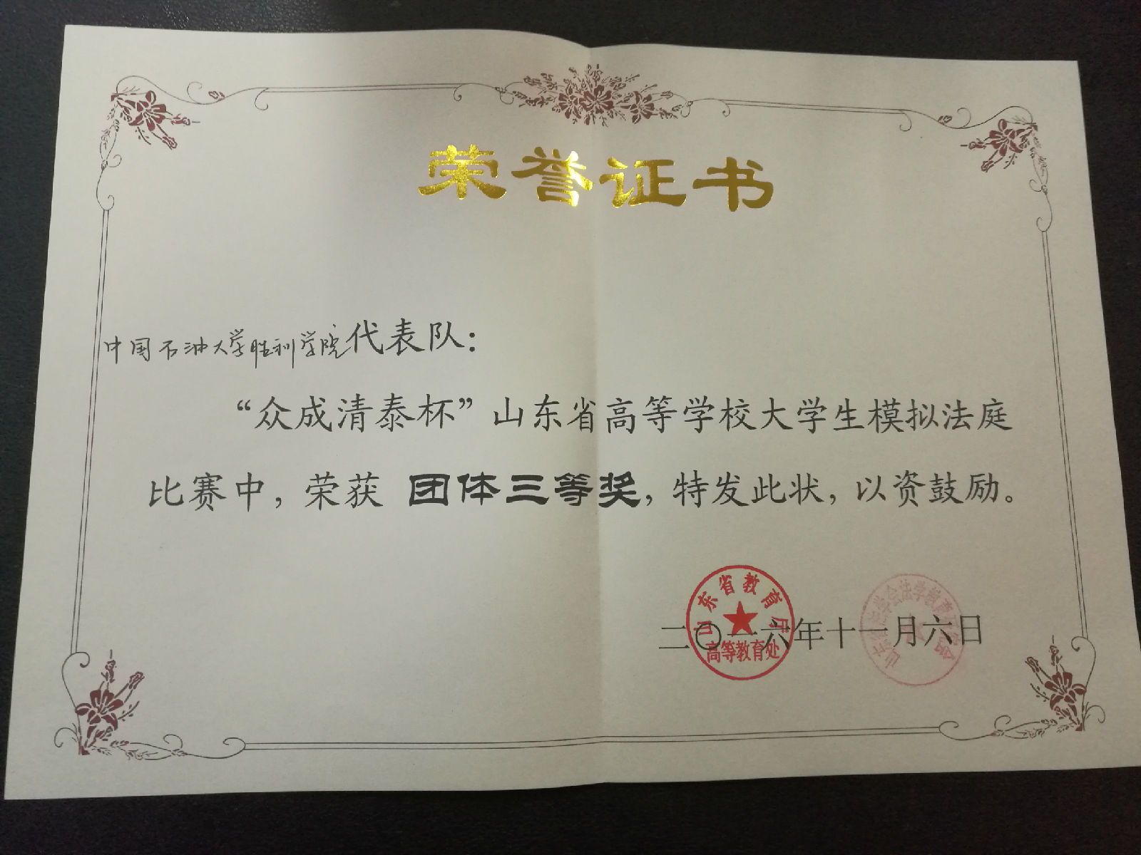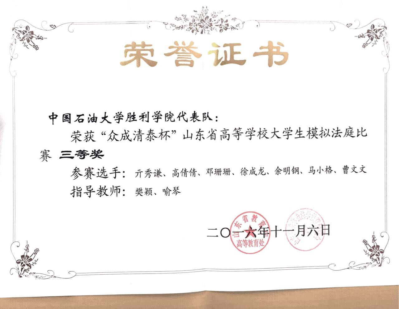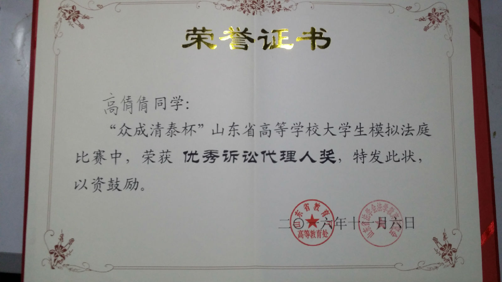 近日获悉,yl23455永利集团在2016年11月举办的“众成清泰杯”第六届山东省高等学校大学生模拟法庭比赛中获得“团体三等奖”,法学系2014级学生高倩倩同学获得“优秀诉讼代理人奖”。