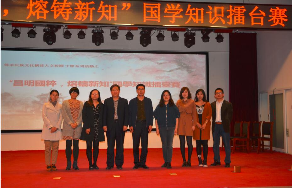 本次比赛分为“心有灵犀”、“博闻强识”、“满腹经纶”三个环节。经过激烈的角逐,有四支代表队入围决赛,化学工程学院为擂主队,机械与控制工程学院、基础科学学院、文法与经济管理学院为攻擂队。比赛过程中,参赛选手们凭着对国学的热爱和知识实力敢于“秀”出自己,凭着“团队就是力量”的精神赛出了我校学子特有的风采。经过紧张激烈的比赛,最终文法与经济管理学院荣获一等奖,基础科学学院队、机械与控制工程学院、化学工程学院队等代表队分别获得二、三等奖。刘莹、朱琳、陈潇、周秀文四位老师荣获优秀指导老师称号。