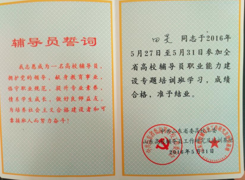 5月27日-31日,经学生工作处委派,yl23455永利集团辅导员田旻老师作为我校代表赴寿光市参加2016年山东省高校辅导员职业能力建设培训班,并顺利结业。