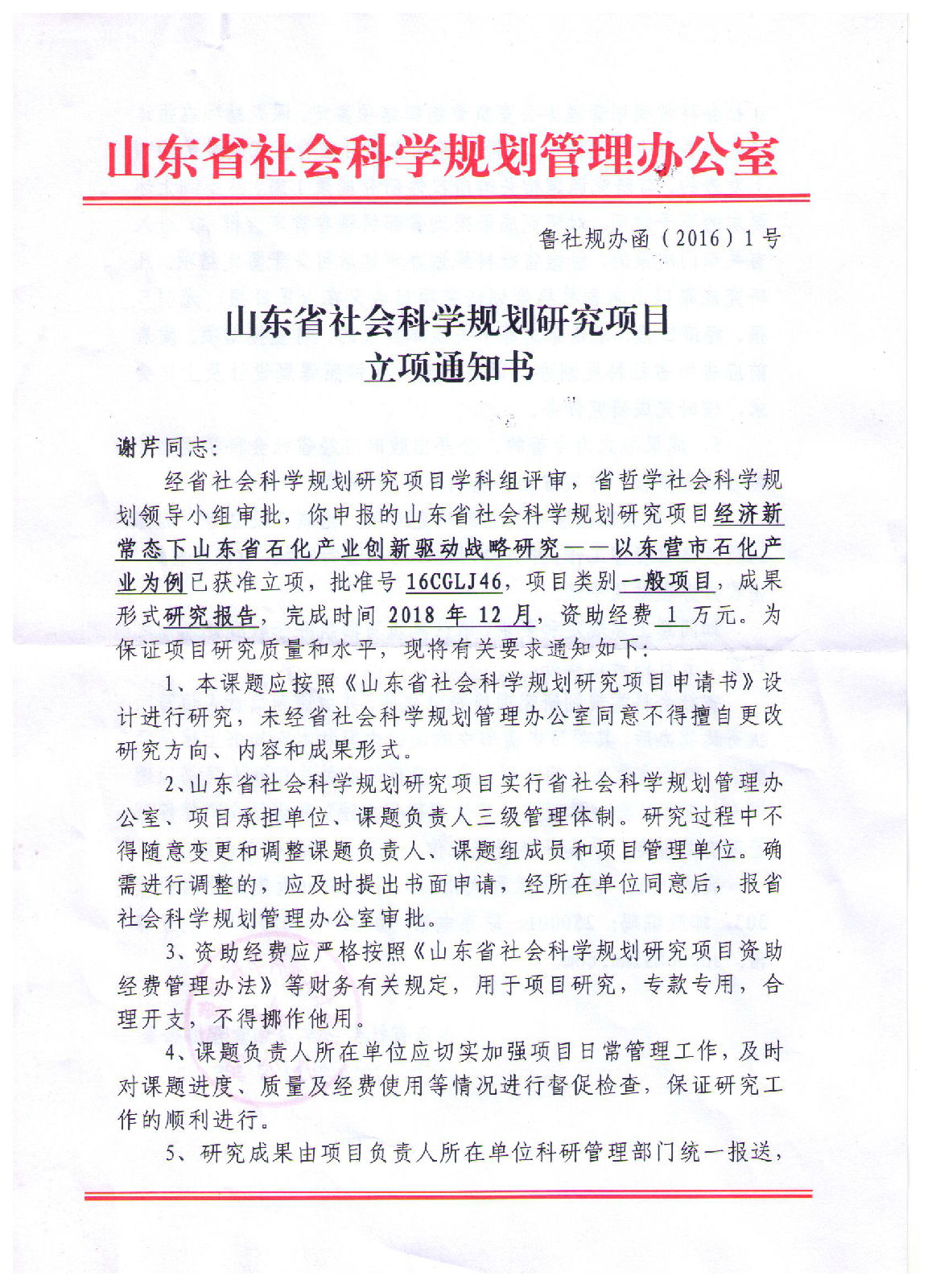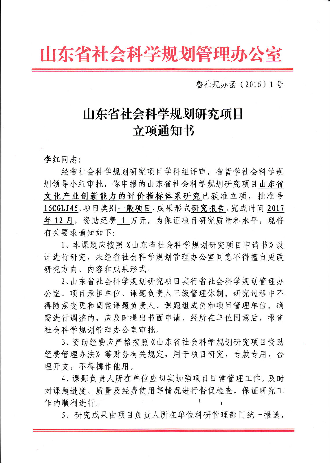 近日,经省社会科学规划研究项目学科组评审,省哲学社会科学规划领导小组审批,yl23455永利集团2项山东省社会科学规划研究项目首次获批立项,分别是李红老师的《山东省文化产业的创新能力评价体系研究》(项目批准号:16CGLJ45)、谢芹老师的《经济新常态下山东省石化产业创新驱动战略研究——以东营市石化产业为例》(项目批准号:16CGLJ46),其项目类别均为一般项目,资助经费1万元。这是yl23455永利集团科研课题的重大突破,凸显了yl23455永利集团教师较强的科研能力。