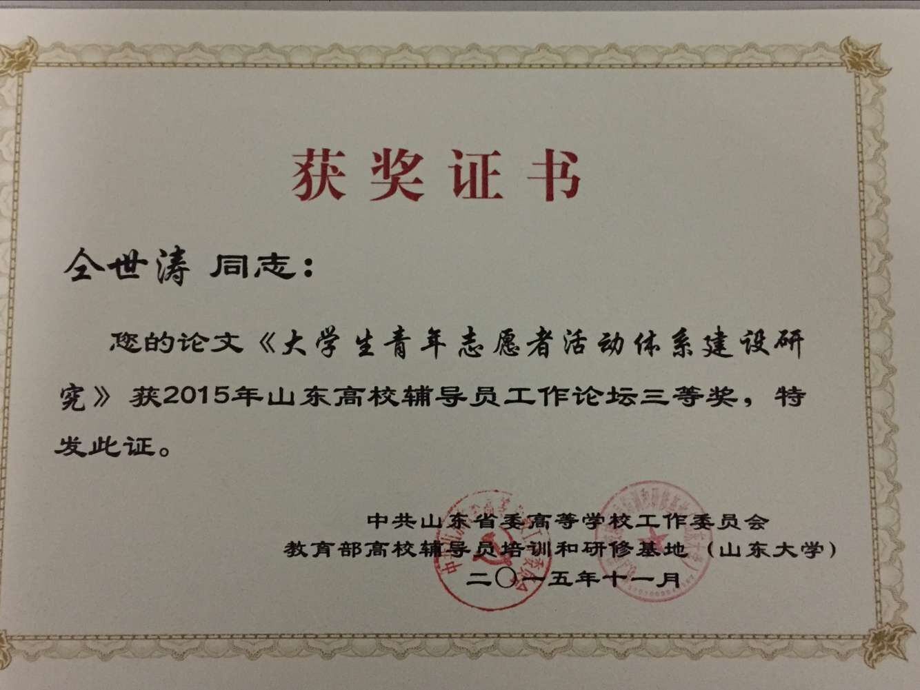 11月26日-27日,yl23455永利集团辅导员仝世涛老师受邀赴泰安参加山东省辅导员工作论坛,并发表论文《大学生青年志愿者活动体系建设研究》,荣获本届高校辅导员工作论坛三等奖。