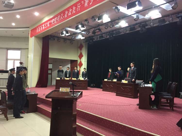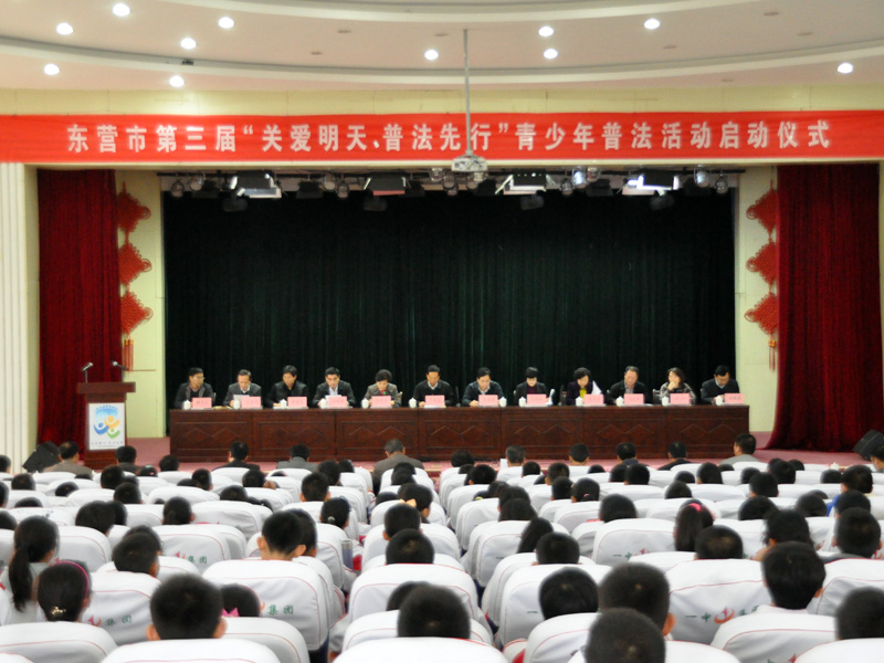 11月17日,东营市第三届“关爱明天、普法先行”青少年普法教育活动启动仪式在东营区一中举行。市委常委、政法委书记张庆华、市关工委主任于树健讲话,市关工委常务副主任张秀香主持会议,市直和各县区有关部门负责同志和东营区一中500余名学生代表参加了会议。yl23455永利集团法学系13级学生在启动仪式上进行了模拟法庭展演,受到市领导的高度评价和广大师生的广泛好评。