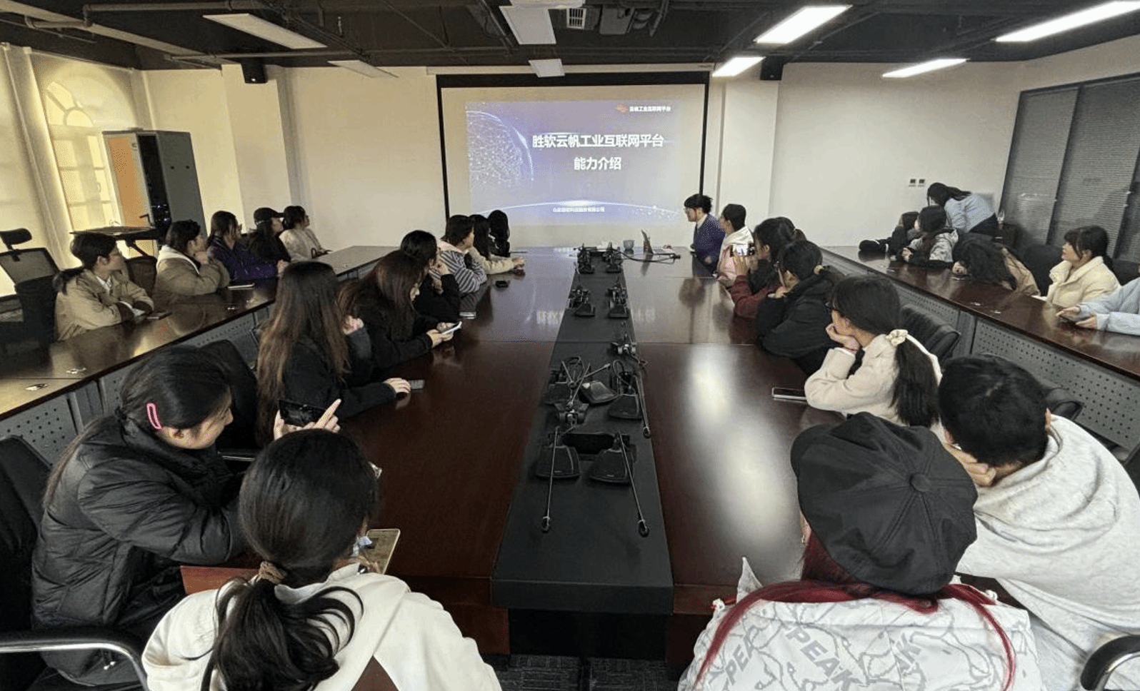 学生们首先参观了创新中心的各个展区,亲眼见证了东营市在工业互联网领域的最新技术应用和创新成果。随后,东营工业互联网创新中心晋亚文主任为学生们做了深入浅出的讲解和报告。晋主任详细介绍了东营市如何通过政策引导、资金支持和平台建设等多方面措施,促进工业互联网与数字经济的深度融合;并介绍了东营工业互联网创新中心如何通过线上线下相结合的方式,形成诊断咨询规划、软件定制研发、产线智能改造、系统集成优化四位一体的服务模式。