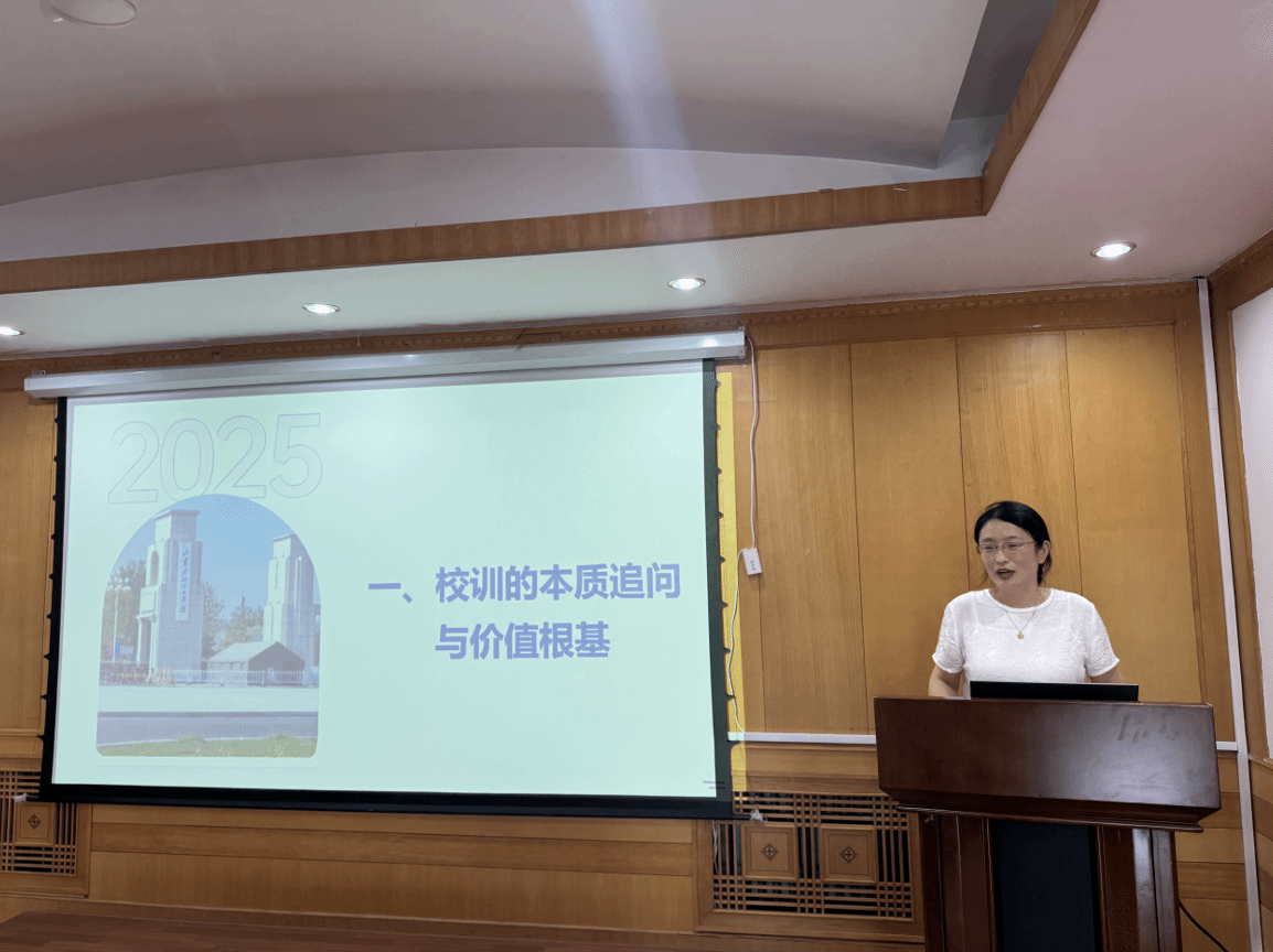 高小晨结合学校发展历程,阐释了校训“明德力行、求实创新”的价值根基、历史渊源与时代意义。她强调,校训是学校办学理念和精神内核的集中体现,全体师生应以校训为指引,在学习和工作中砥砺品格、追求卓越,真正做到“明德力行筑基业,求实创新向未来”。