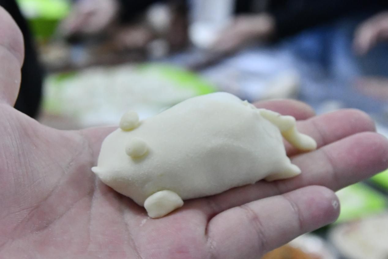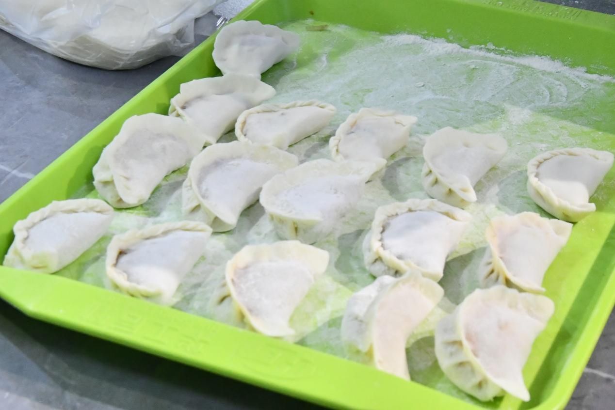 活动现场笑语盈盈,大家围桌而坐,挽起衣袖分工协作。取皮、放馅、捏褶,动作娴熟的同学手起饺成,胖嘟嘟的元宝饺整齐排列;创意十足的同学则脑洞大开,包出月牙形、金鱼形、花朵形等各式饺子,灵动可爱的造型让现场趣味横生。擀皮声、谈笑声、调侃声交织在一起,暖意随着氤氲的水汽不断升腾,关怀的话语顺着指尖的温度淌进彼此心间。